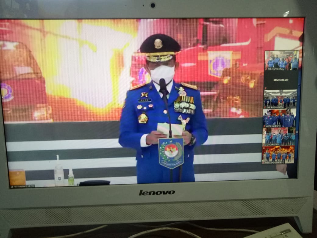 Sejumlah personil Satpol PP dan Damkar Kotabaru mengikuti petingatan HUT ke-102 Pemadam Kebakaran (Damkar) secara virtual, Senin (1/3/2021).