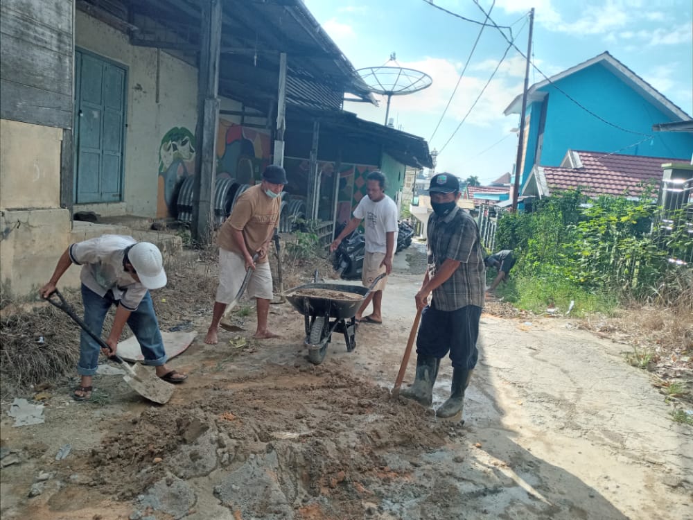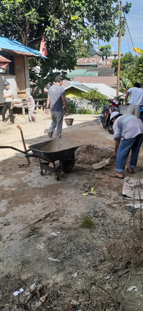 Warga RT 2 Kelurahan Baharu Selatan, Kecamatan Pulau Laut Sigam gotong royong memperbaiki jalan yang rusak di lingkungannya, dari samping Poskamling Gang Irama sepanjang Jalan Gang.