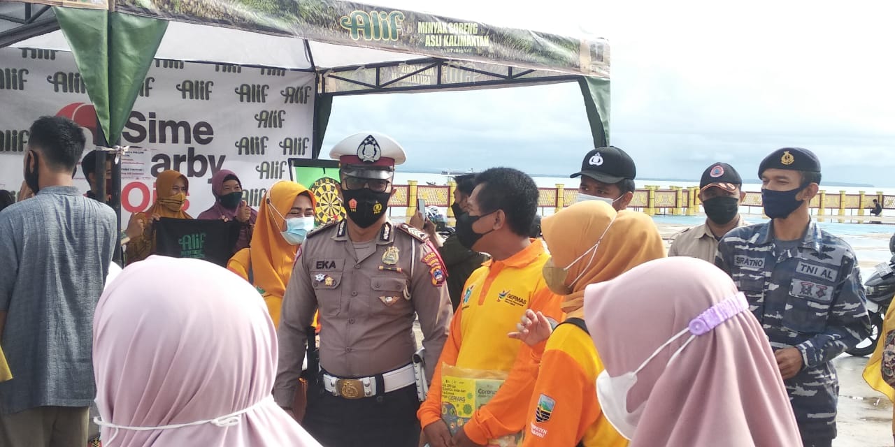 Anggota Polres Kotabaru, Bripka Eka Rusman Hadi dan rekannya mengimbau masyarakat di Pasar Murah Siring Laut agar tetap mematuhi protokol kesehatan (Prokes).